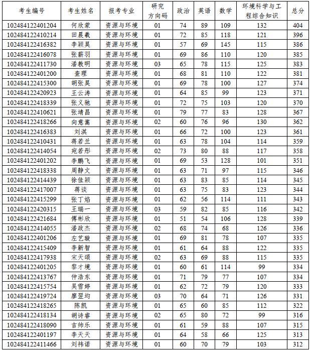 3. 资源与环境专业的01方向录满后,未录取者(需复试成绩高于120分)可在同一专业内调剂。根据调剂意愿,按照考生总成绩从高到低择优录取到同一专业的其他研究方向,额满为止。