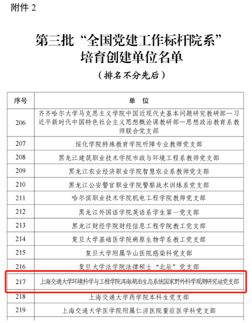 2018年,洱海党支部案例《扎根洱海一线 开展科学攻关》被遴选编入中组部党员教育和干部测评中心与教育部思想政治工作司编写的《基层党组织书记案例选编(高校版)》。2021年,洱海党支部荣获“上海市先进基层党组织”、“上海市教卫工作党委系统先进基层党组织”称号。2022年,洱海党支部获评“全国党建工作样板支部”培育创建单位并组建育人号工作小组。同年,“生态文明建设的洱海路径——大理洱海保护治理研究经验”主题案例获教育部学位与研究生教育发展中心立项。