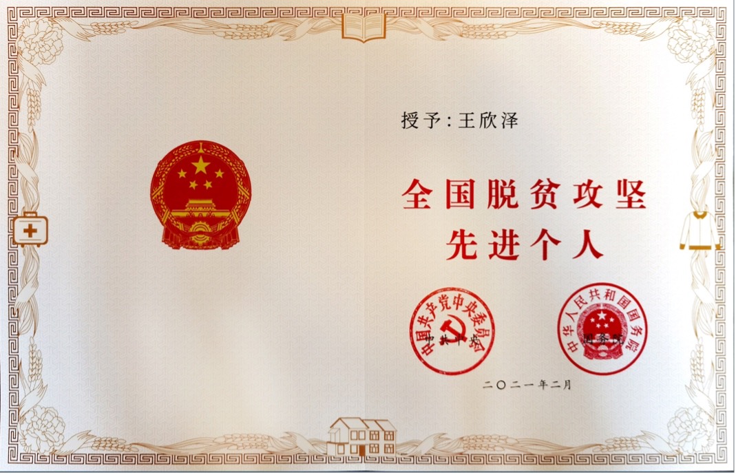 2021年,支部书记王欣泽荣获党中央、国务院授予的“全国脱贫攻坚先进个人”称号
