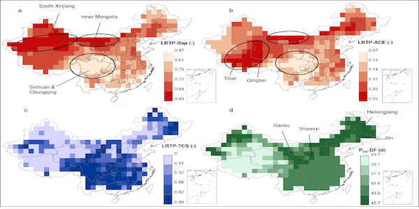 图2. 在不同区域排放时苯并[a]芘、苊和三氯生的长距离输送潜力(LRTP,a-c),以及二苯并呋喃的环境持久性(Pov,d) (3)