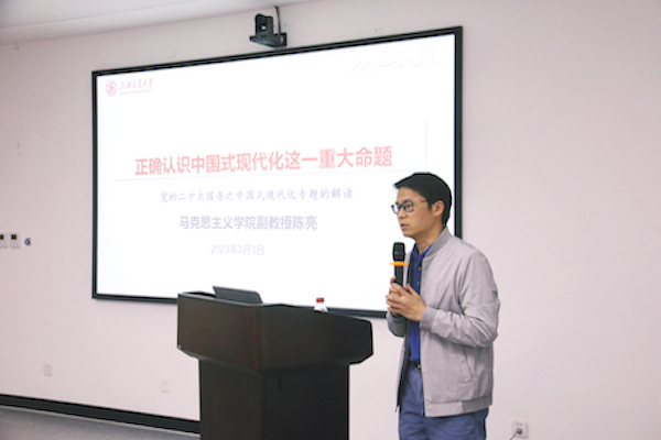 3月3日下午,a片漫画 举办中国式现代化专题党课,特邀马克思主义学院陈亮副教授作题为“正确认识中国式现代化这一重大命题—党的二十大报告之中国式现代化专题的解读”专题讲座。学院党委中心组全体成员、师生党支部书记、支部委员、团学骨干等参加学习,党委书记胡薇薇主持会议。