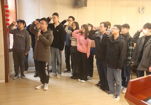 近期入党的预备党员在本科生党支部书记宋宇轩的带领下面向党旗庄严宣誓。