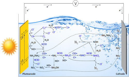 2017年,周保学教授团队在Water Research (2017, 108, 293-300)发表了WO3光阳极产Cl•氧化氨氮脱氮的方法。与折点法相比,Cl•能够更快速地攻击氨氮(1.1×109 M−1 s−1),捕获氨氮中的氢原子形成•NH2,进而将氨氮氧化为氮气。之后通过阳极材料的设计(如WO3、TiO2/WO3、BiVO4/WO3、Co3O4/BiVO4等),强化了Cl•的生成,提高了氨氮的去除效果。该方法还具有所需氯离子浓度低、避免氯气污染的特点。