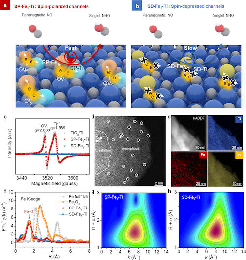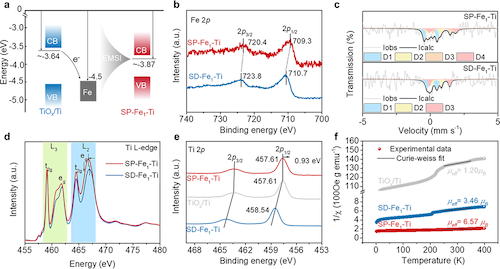通过X射线光电子能谱(XPS)、穆斯堡尔谱(Mössbauer spectra)、X射线吸收谱(XAS)以及磁化率-温度曲线(M-T)等多项表征,团队成功证实氧空位诱导的自旋极化Fe1-Ti双位点的产生机制,揭示SP-Fe1-Ti整体电极表面以自旋极化的Fe2+和Ti3+物种为主导。