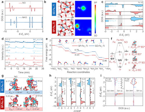理论计算结果揭示了催化中心自旋极化对电极活性的影响机制,即SP-Fe1-Ti电极中Fe和Ti原子的未成对自旋电子可以有效与关键中间体相互作用,促进NO3−脱氧为*NO以及随后的*NO加氢过程,从而改善电极NITRR活性。