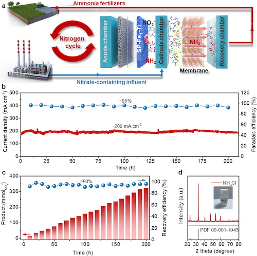 团队还将基于SP-Fe1-Ti阴极的流通式NITRR电解槽与氨回收单元耦合,探索硝氮污染物资源化处理工艺,同步实现工业级电流密度下硝氮选择性还原制氨和原位高纯度氨回收。