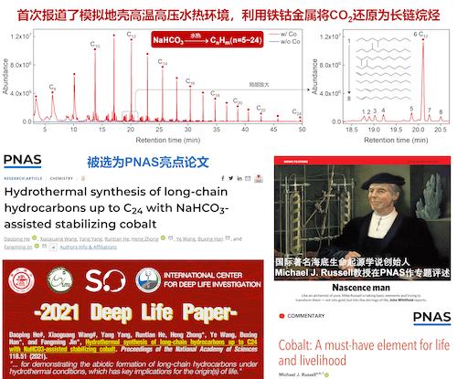 金放鸣团队通过构建全新的模拟地壳深部高温高压水热环境的实验方法,以铁粉为还原剂,钴粉为催化剂,在300 °C和300个大气压下,成功将二氧化碳/碳酸氢钠水热还原为链长达二十四碳的烷烃及烯烃。研究发现了钴金属在碳酸氢根存在下的水热自修复稳定机制,打破了钴遇水即失活的传统认知,重新认识了钴的催化性能。利用新开发的高温高压水热原位红外揭示了零价钴与铁表面羟基物种对反应中间体一氧化碳的吸附与氢化偶联的协同作用。