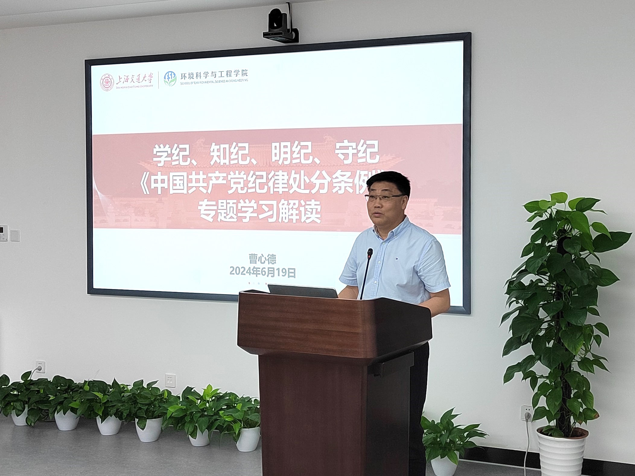 曹心德以“学纪、知纪、明纪、守纪”为主题作专题党课。他介绍了《中国共产党纪律处分条例》的主要内容和历次修订情况,围绕分则中的各项规定做了详细解读。会上还播放了廉洁教育微视频《坚守·初心》和警示教育微视频《一篇论文》《科研莫失信》。他强调,要结合工作实际,健全长效机制,把纪律学习融入日常工作,切实将党纪内化于心、外化于行,推动学院各项工作迈上新台阶。