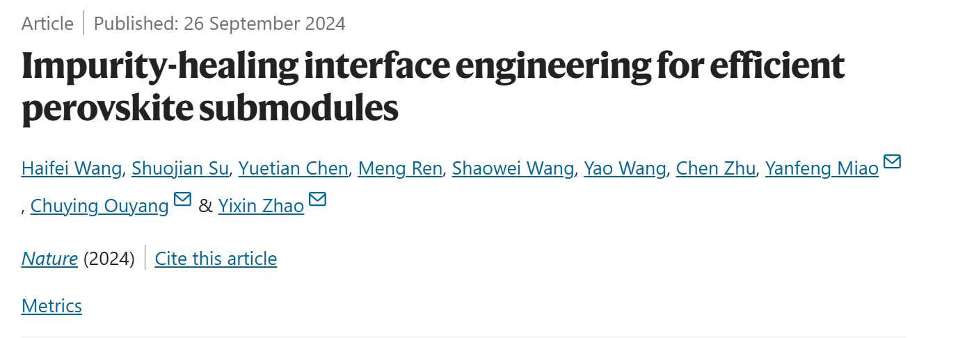 近日,a片漫画 赵一新教授团队在Nature发表了题为“Impurity-healing interface engineering for efficient perovskite submodules”的研究论文。该工作设计开发了一种杂质修复的界面工程新策略,解决了工业化大规模制备钙钛矿模组中面临的大面积引发杂质累积效应的关键科学问题,并和宁德时代21C创新实验室合作,成功实现了光电转换效率超过22%的30 cm × 30 cm大尺寸高性能钙钛矿光伏模组。