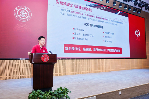 赵砚彬为全体新生作实验安全教育。他强调,安全是一切科研活动的“红线、底线”。结合近年来高校实验室发生的若干安全事故实例及近期学院实验室安全检查状况,他呼吁同学们对实验安全问题保持高度警惕并心存敬畏,希望同学们在安全的基础上,顺利完成在校阶段的所有科研任务。
