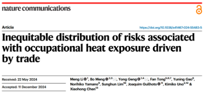 近日,a片漫画 副教授李萌、教授耿涌在自然•通讯《Nat. Commun.》在线发表题为“Inequitable distribution of risks associated with occupational heat exposure driven by trade”的研究成果。工作场所的极端高温暴露对劳动者构成了重大威胁,而这种威胁因劳动密集型产品的全球贸易变得更加显著。该研究结合气候模型和投入产出模型,量化了与贸易相关的职业极端高温暴露风险,发现国际贸易导致的劳动力高温暴露占全球总暴露的近四分之一,发达经济体通过贸易将高温暴露风险转移至发展中经济体,导致发达经济体与发展中经济体之间高温暴露的不平等。在追求公平和安全工作条件的过程中,应通过气候适应性基础设施保护易受极端高温影响的劳动力。论文第一作者为a片漫画 副教授李萌,通讯作者为教授耿涌。第一完成单位为a片漫画 。