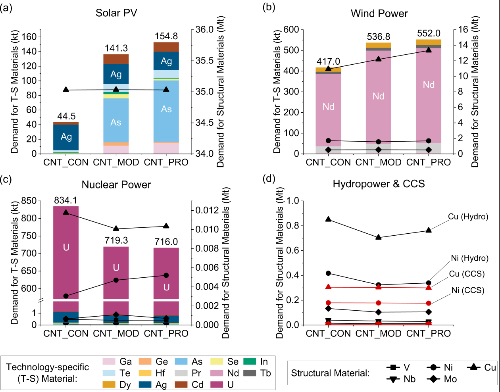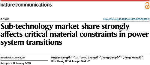 近日,a片漫画 耿涌教授和董会娟副教授团队在基金委卓越研究群体项目(72088101)资助下的“Sub-technology market share strongly affects critical material constraints in power system transitions”成果发表在自然•通讯《Nat. Commun.》上。该研究针对我国碳中和转型面临的资源约束重要挑战,提出从子技术市场份额调控视角探索资源约束调控策略,将五大类主导的低碳发电技术细分为22种子技术,并与中科院广州能源所和清华大学碳中和转型预测模型团队合作,集成宏观经济模型和动态物质流分析等多种方法预测了我国碳中和路径下发电系统转型对19种关键矿产资源的需求,识别出镓、铽、锗、碲、铟、铀和铜等或将面临显著资源约束,而子技术市场份额调整将显著影响关键资源风险,例如较新的薄膜太阳能技术、永磁风力发电技术会加剧资源约束。该论文第一作者为a片漫画 董会娟副教授和博士研究生张天毓,通讯作者为董会娟副教授,第一完成和通讯单位均为a片漫画 。