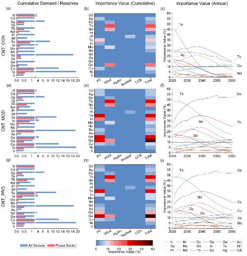该研究主要集成宏观经济模型和动态物质流分析等方法,量化了基准情景及碳中和情景下我国发电系统转型过程中光伏发电、风力发电、水力发电、核能发电以及热电厂/碳捕集、利用与封存(CCUS)等五种主要发电技术下的22种子技术对19种矿产资源的需求。通过调整碳中和情景下各子技术的市场份额,揭示了低碳发电技术子技术市场份额变化对关键矿产资源需求的影响特征。最后,引入了“重要性指数”(即发电系统转型过程中资源需求在各部门总需求中的占比)这一指标,并结合资源需求与储量的比值,识别我国碳中和目标下发电系统转型可能带来约束的关键矿产资源种类。