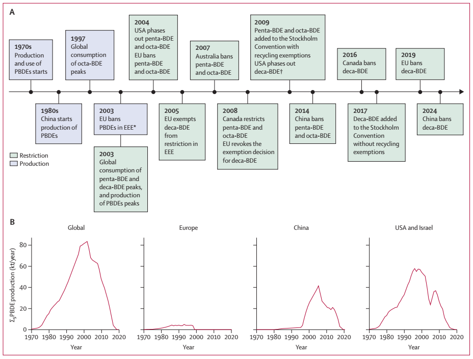 图1:PBDEs的监管行动时间线及全球生产趋势 (A) PBDEs的生产时间线及主要监管政策。 (B) Abbasi等估算的全球及区域PBDEs生产趋势。EEE=电气和电子设备。PBDE=多溴二苯醚。