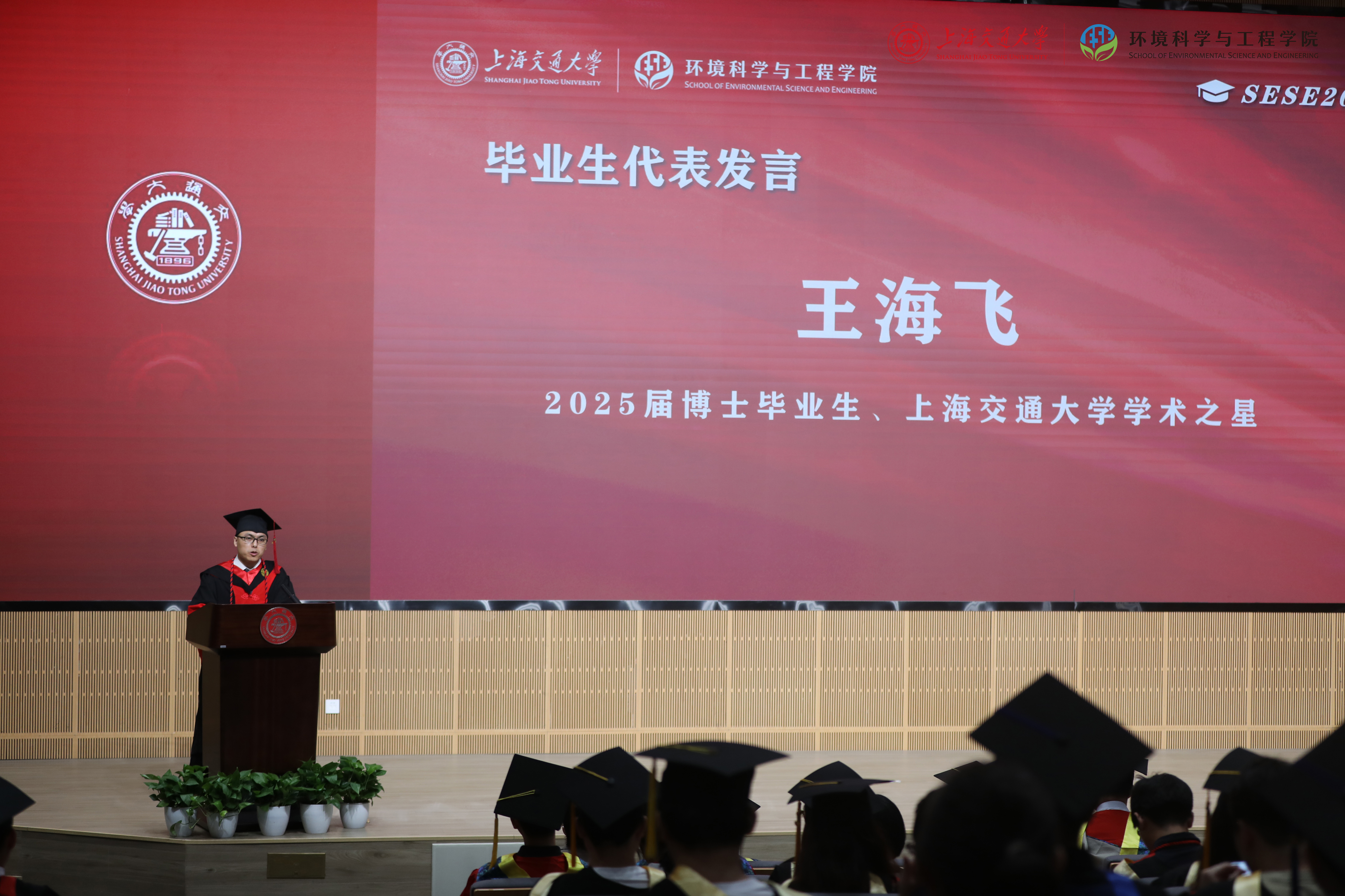 学院2025届博士毕业生王海飞以“未来,我们一帆风顺”为主题发言。他分享了自己求学与科研的经历,在学院和老师的关心、支持与指导下,他在一次次失败中收获在留白处开疆拓土、在混沌中开辟道路的勇气和能力。他深情感谢学校、学院、师长的培养,并祝愿全体毕业生梦想常青,担当常在。