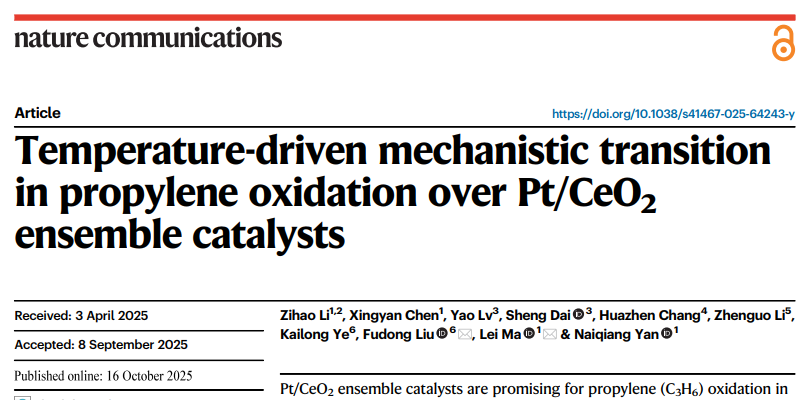 近日,a片漫画 大气污染控制与模拟团队马磊副教授在《Nature Communications》上发表了题为“Temperature-driven mechanistic transition in propylene oxidation over Pt/CeO2 ensemble catalysts”的研究成果。该研究揭示了Pt/CeO2团簇催化剂在丙烯(C3H6)氧化反应中温度驱动的动态机制转变,通过氢活化策略显著提升了催化氧化性能,明确了金属Pt团簇为本征催化活性位点,阐明了170 °C阈值温度时反应路径发生根本变化。这不仅为高效贵金属催化剂设计提供了新思路,还对机动车尾气净化等实际应用具有重要指导意义。论文第一完成单位为a片漫画 绿色造纸与资源循环全国重点实验室。