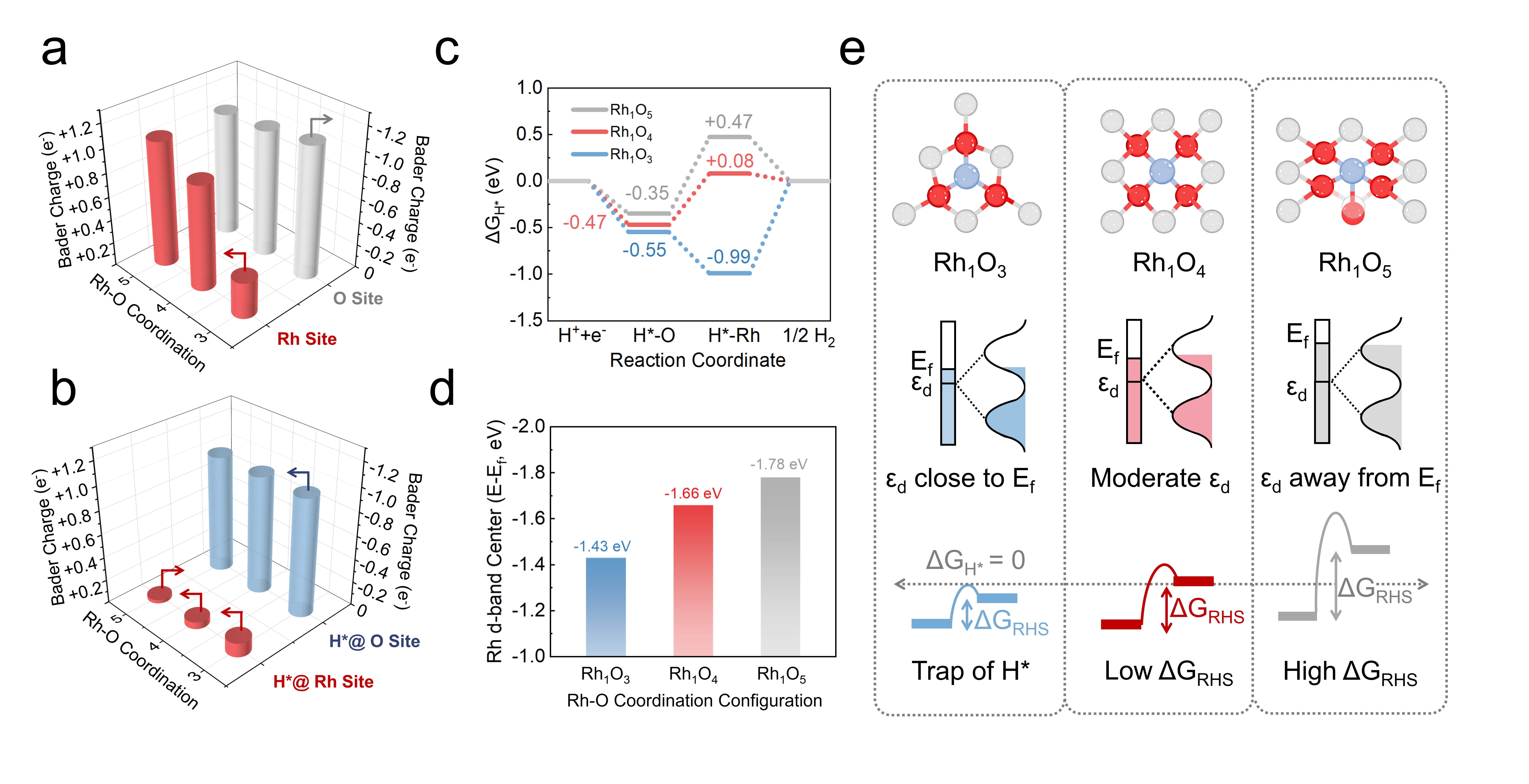 态密度分析显示,随着Rh-O配位数的上升,Rh的d带中心从 –1.43 eV(Rh1O3)逐渐下移至 –1.66 eV(Rh1O4)和 –1.78 eV(Rh1O5),表明Rh上H*吸附逐级减弱,与氢吸附能结果一致。上述分析表明,Rh-O配位数上升会导致 Rh d 轨道电子密度下降,进而削弱其与H*的相互作用。Rh1O4 独特的电子结构、配位构型使得H*可以高效地从相邻O向Rh迁移,并最终脱附、参与还原反应。
