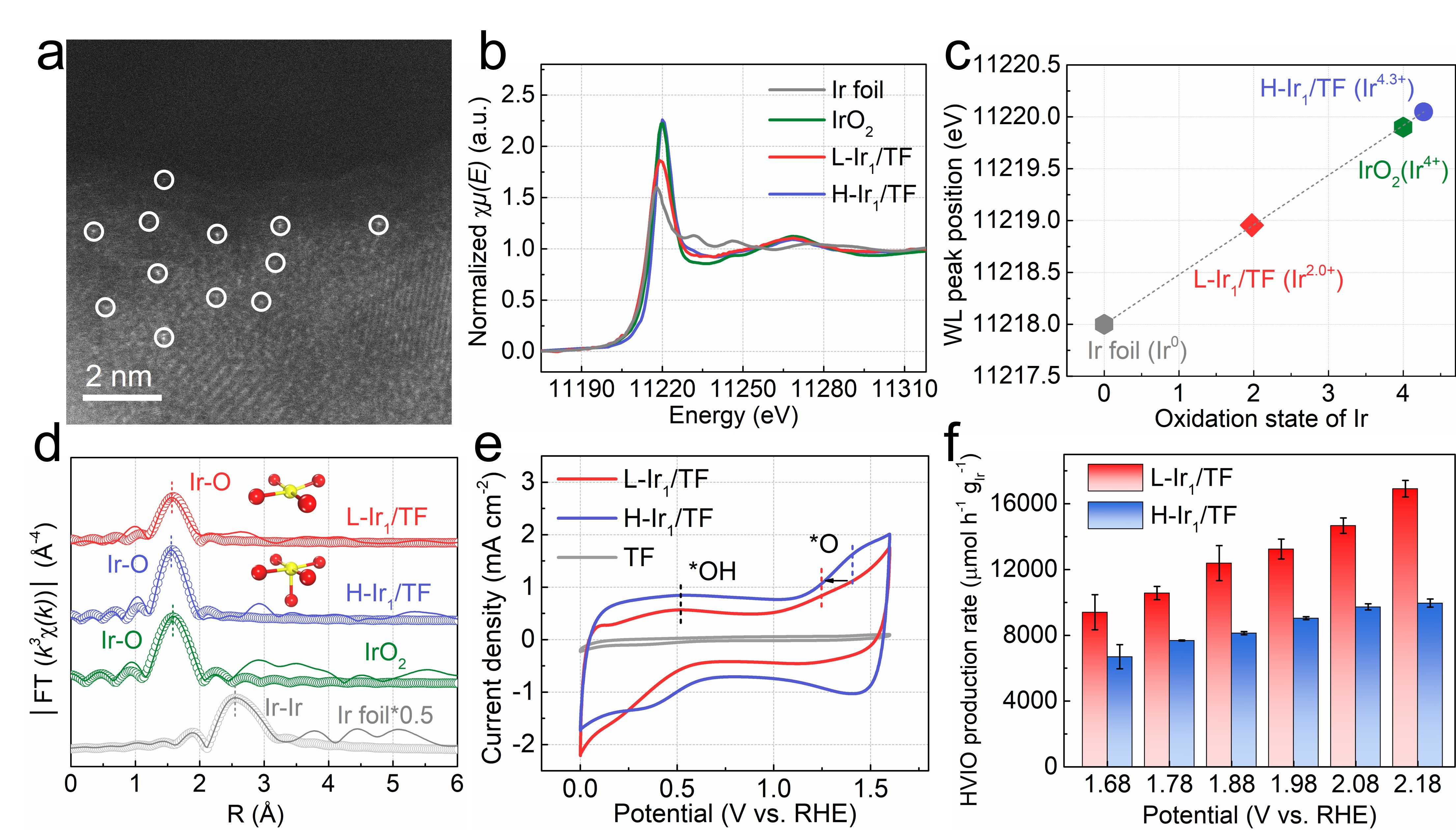 该团队通过精细控制退火气氛的氧化还原性,在泡沫钛基底(TF)上锚定了具有不同氧化态的Ir单原子(L-Ir1/TF和H-Ir1/TF)。球差矫正高角环形暗场扫描透射电镜(HAADF-STEM)照片中明亮的亮点证实了Ir的单原子存在。通过X射线吸收谱(XAFS)中白线峰位置确定了L-Ir1/TF和H-Ir1/TF电极中Ir的氧化态分别为+2.0和+4.3。X射线吸收精细结构谱(EXAFS)的拟合结果揭示了L-Ir1/TF和H-Ir1/TF电极中Ir与O的配位数分别为4和5。通过循环伏安法和探针分子法分别证实了在两个电极上的电合成得到的HVIO。其中L-Ir1/TF电合成HVIO的能力更强,在2.18 V vs RHE的电位下能实现16,920 μmol h-1 gIr-1的卓越HVIO生成速率,是H-Ir1/TF的1.7倍。