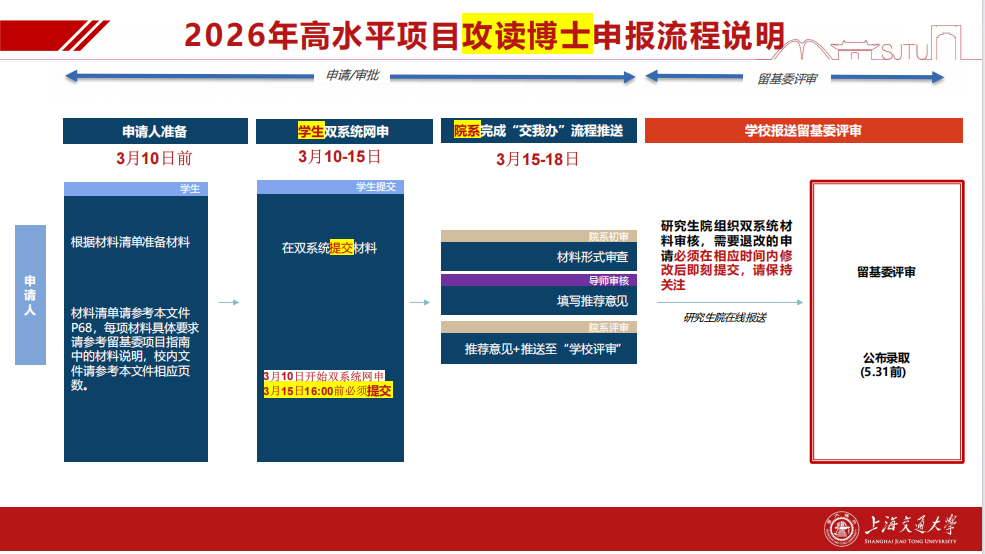 时间节点: 学生需于3月8日前,获得外方接收函(正式通知书或邀请信)、完成申报材料准备,并完成“交我办”系统申请。