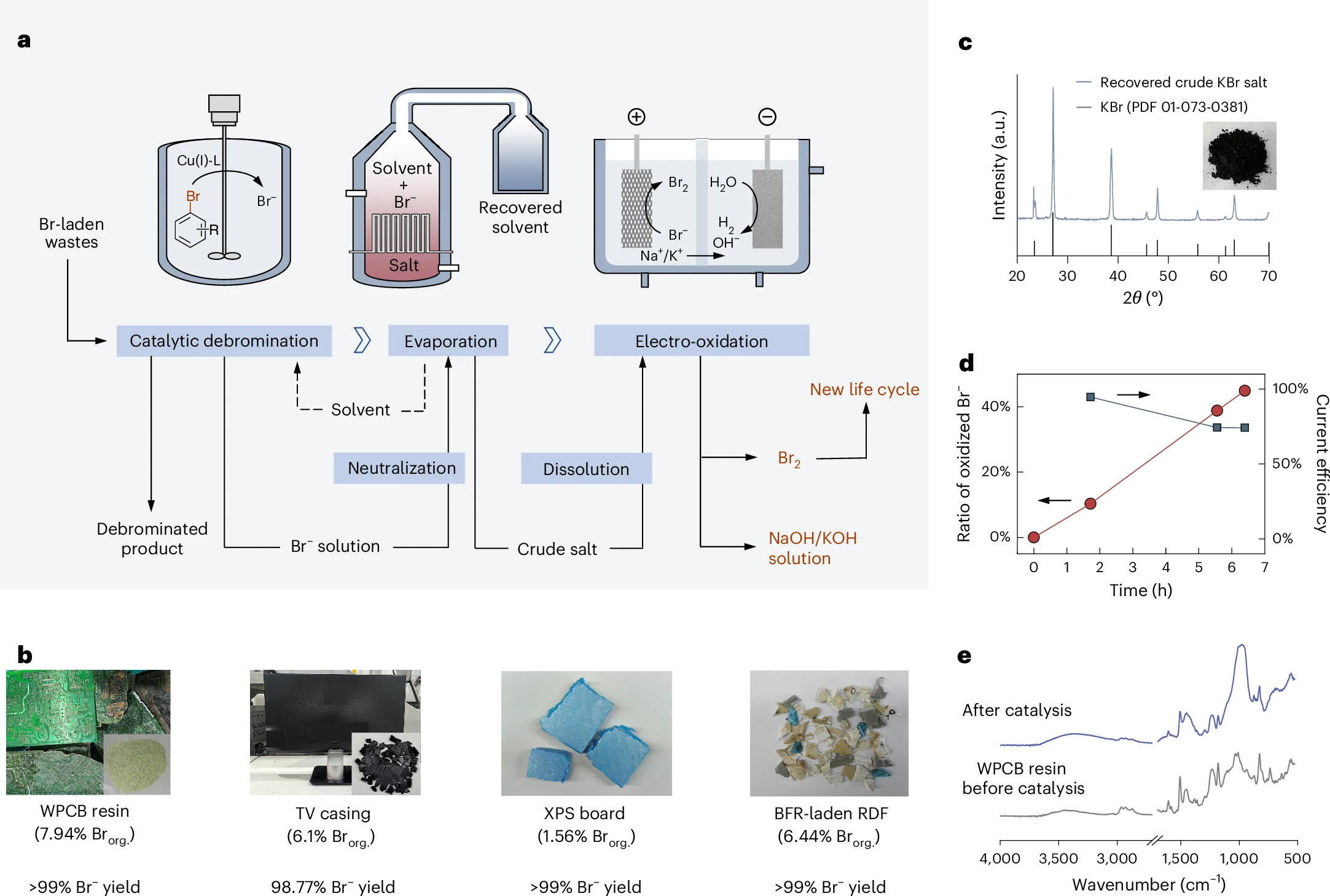 溴(Br)是阻燃剂的关键元素,在电子电器、家具等产品阻燃方面起重要作用。然而,当这些产品被废弃后,溴会以持久性溴化污染物的形式持续释放到环境中,不仅造成严重的环境问题,还导致溴资源流失。该研究针对废弃物中溴形态复杂、C-Br键键能高、难回收的问题,开发了一种基于Cu(I)催化的乌尔曼型脱溴体系,能够选择性地将废弃物中各种有机溴化物转化为溴离子,并能进一步通过蒸发-氧化等过程回收溴素原料。这项工作为溴回收提供了一种可行方法,并有望促进可持续的溴循环。