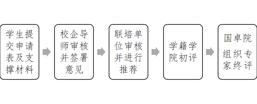 奖学金评选实行“学生申请—导师审核—企业推荐—学院初评—国卓院终评”五级流程,具体如下: