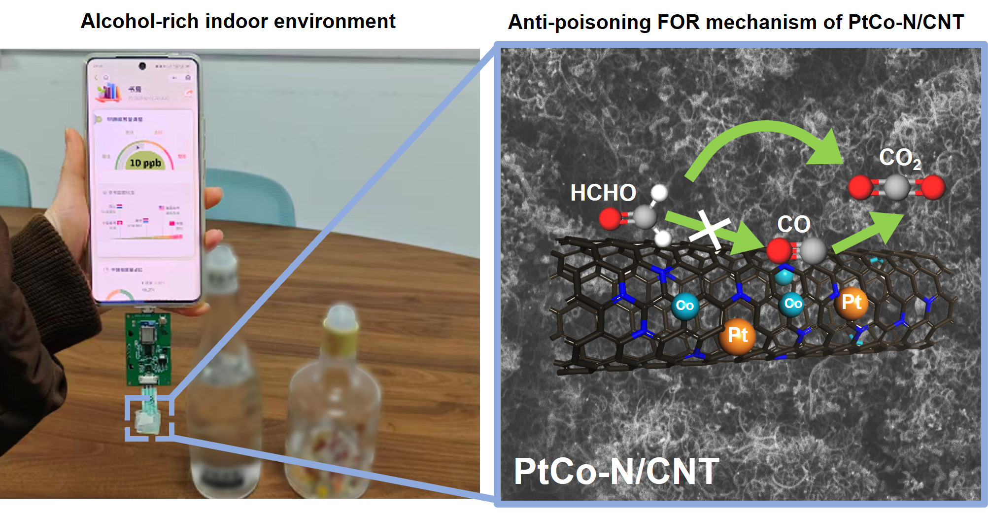 针对这一挑战,研究团队提出了Pt-Co双金属协同与富氮掺杂碳纳米管(N/CNT)载体相结合的复合改性策略。通过氨辅助双金属协同模板法精准构筑的Pt2.32Co-N10/CNT催化剂,实现了三重创新:(1)抗中毒载体:富氮掺杂的碳纳米管通过酸碱相互作用优先吸附甲醛,有效阻挡甲醇等干扰物,并从电子层面弱化CO等中毒中间产物的吸附;(2)协同活性中心:Pt-Co双金属协同调制电子结构,提升了对甲醛氧化反应(FOR)的催化活性;(3)界面协同增效:一维碳纳米管骨架结构加速电子传递,N-Pt/N-Co强配位键稳定了活性位点,实现了“1+1+1>3”的效果。进一步结合丝网印刷电极制备技术,开发的便携式甲醛传感器在富醇室内环境的实际监测过程中,展现出强于商用传感器的选择性与稳定性。