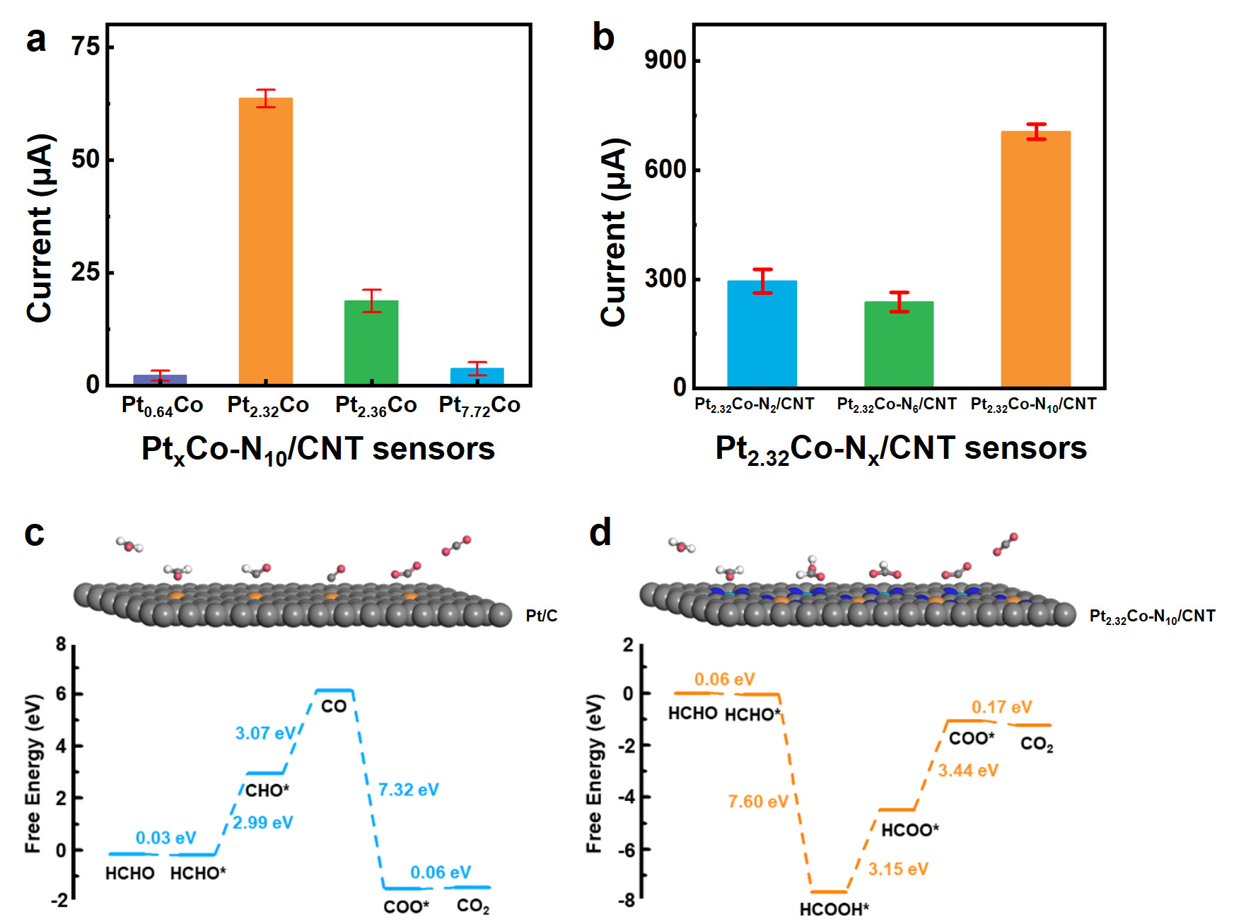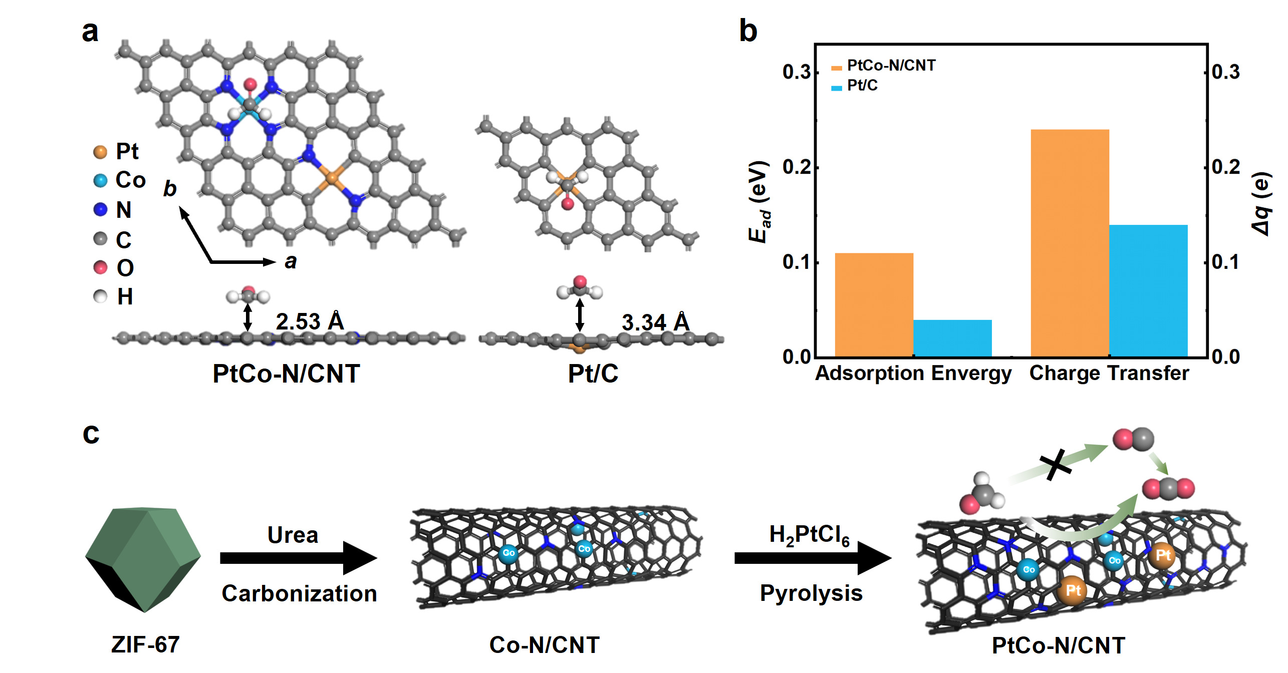 团队首先通过密度泛函理论(DFT)计算揭示了传感材料的原理:相比商用Pt/C,富氮载体和Pt-Co双金属位点的协同作用,不仅显著增强了对甲醛的选择性吸附,同时大幅弱化了CO的毒化作用(图1)。基于此,团队以ZIF-67为模板,通过调控尿素比例与铂钴质量比,成功合成了铂钴纳米颗粒与单原子共分散的富氮碳纳米管电催化剂Pt2.32Co-N10/CNT,实现了双金属协同与氮调制的双重效应。