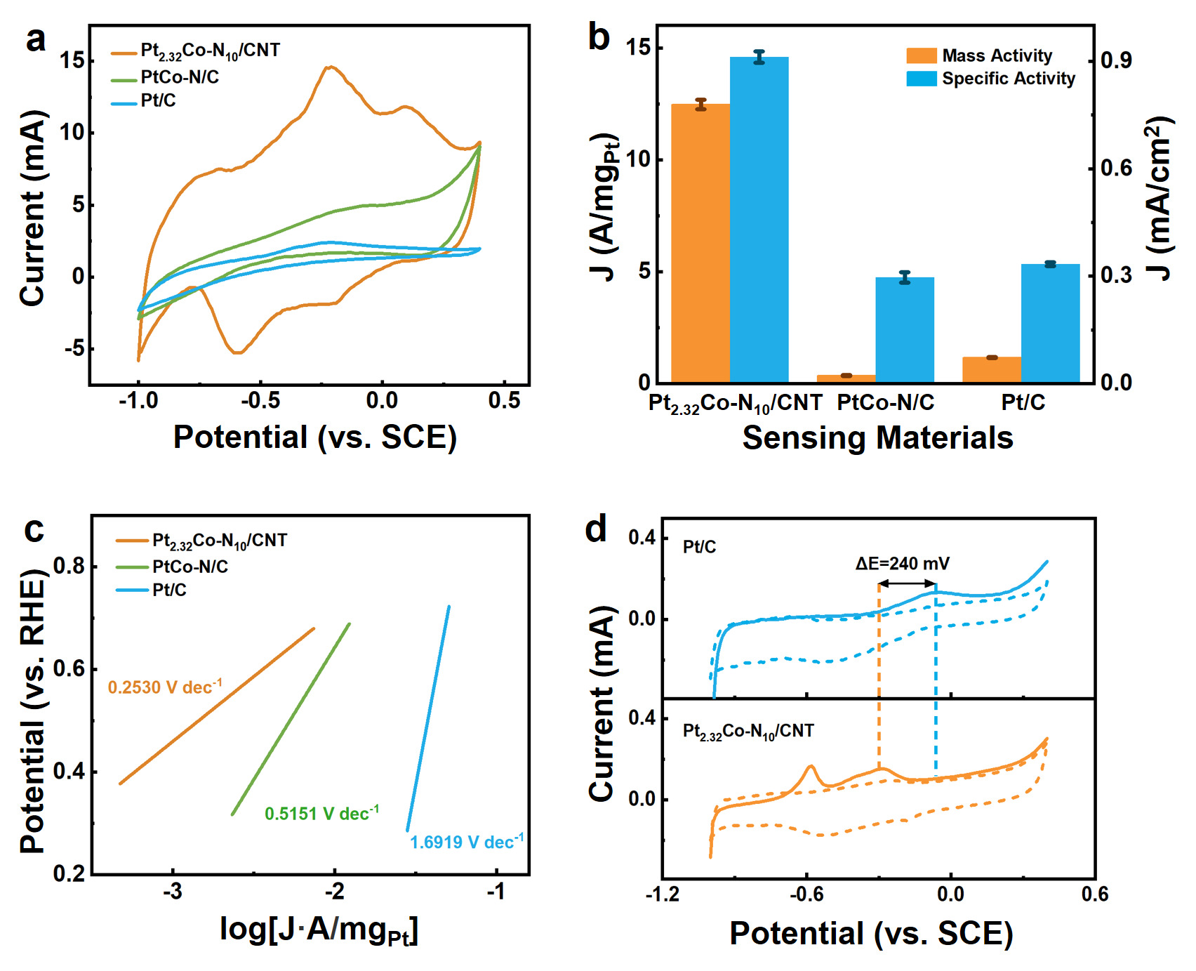 图3 Pt2.32Co-N10/CNT电催化剂对甲醛的电化学性能测试