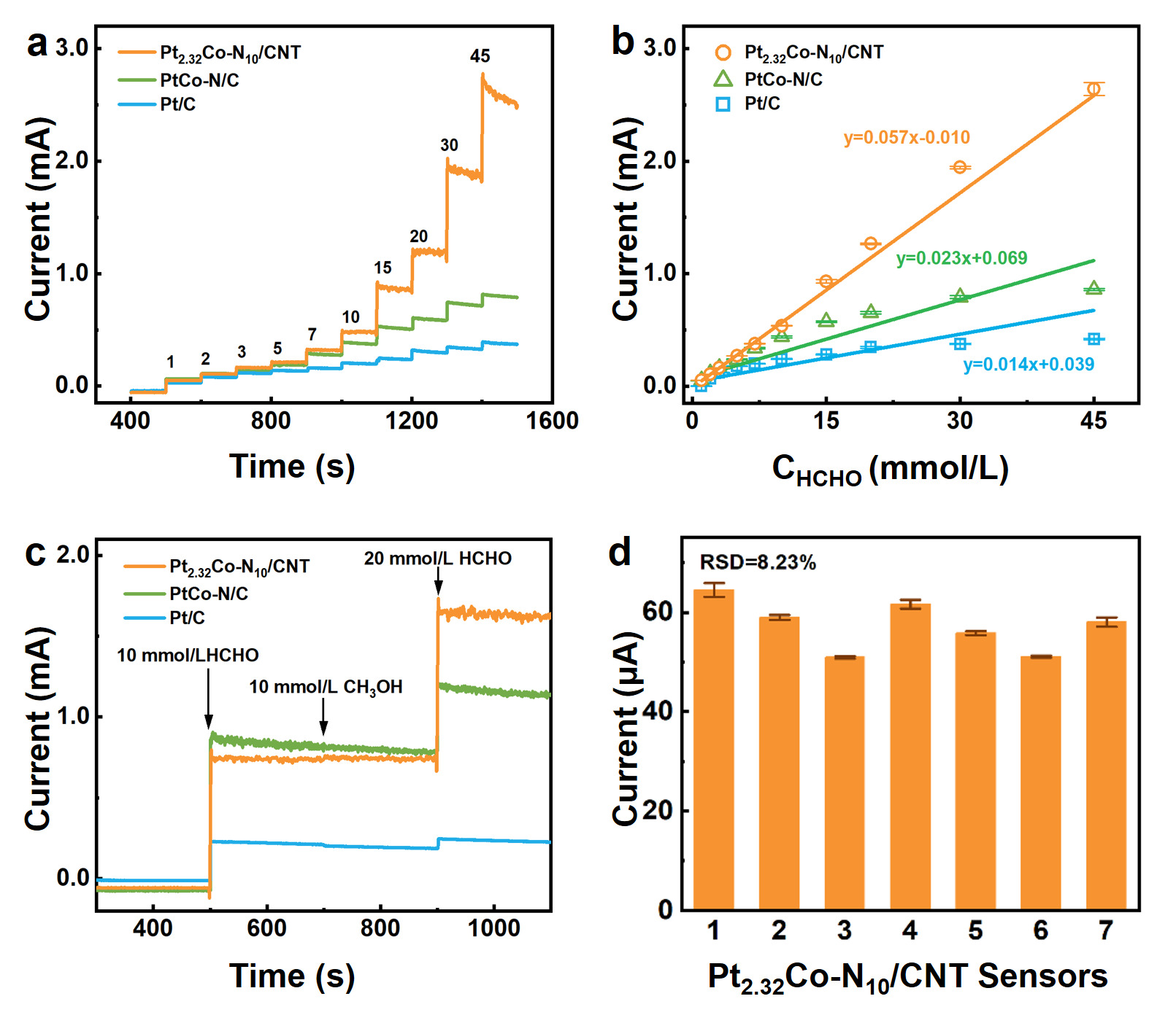 电化学测试结果显示,Pt2.32Co-N10/CNT的甲醛氧化质量活性达商用Pt/C的5.32倍,比活性提升2.73倍(图3)。基于此构建的传感器,灵敏度高达458.62 μA·mmol/(L·cm2),是商用Pt/C的4.12倍,检测限低至0.79 mmol/L(图4)。尤其在甲醇等干扰物存在时,该传感器的电流波动远低于商用传感器,且批量制备的传感器响应高度一致(RSD = 8.23%),展现出优异的选择性和可重复性。