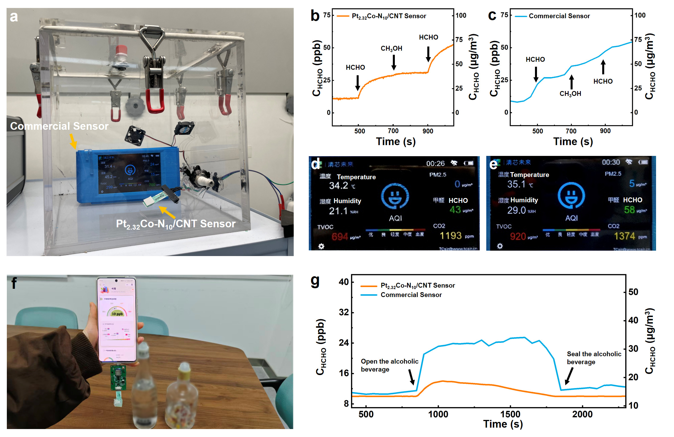 为验证实际应用潜力,团队将电催化剂与丝网印刷电极集成,制备了便携式传感器,并在真实富醇室内环境中与商用传感器进行了正面对比测试(图6)。结果显示,在甲醛与甲醇混合气氛中,Pt2.32Co-N10/CNT传感器的假阳性波动仅1.93%,而商用传感器高达31.03%;在含酒精饮料的室内环境中,商用传感器读数易受波动,而Pt2.32Co-N10/CNT传感器读数稳定,抗干扰能力提升10倍,7天响应保留率超96%,满足WHO与我国《室内空气质量标准》(GB/T 18883-2022)的检测要求。