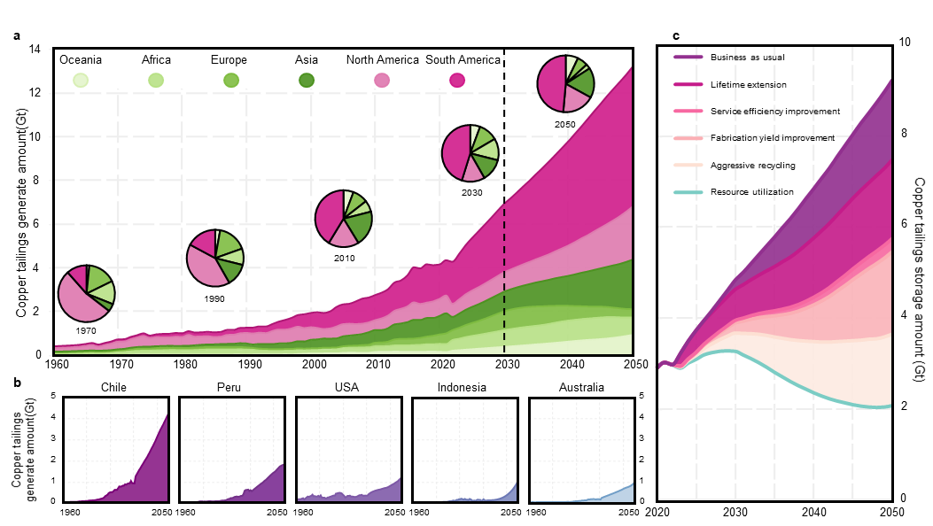 近日,a片漫画 耿涌教授与南开大学徐鹤教授团队合作在Nat. Sustain.上发表了题为“Global copper tailings distribution and projection”的研究成果。人类发展和应对气候变化需要大量的矿产资源,而矿产开发过程中产生的大量尾矿正成为全球可持续发展的关键挑战。近年来,尾矿库失事的规模与影响不断加剧。但在全球尺度上,仍难以明确优先治理区域及高效管理路径。本研究聚焦全球主要铜生产国,系统刻画了铜尾矿的时空分布及未来演变趋势。结果表明,在铜需求持续增长和矿石品位逐步下降的双重驱动下,全球铜尾矿产量预计至少在本世纪中叶前仍将持续上升。基于此,研究提出亟需构建系统性、综合性的尾矿治理策略,强化多利益相关方协同,以有效应对日益严峻的尾矿风险挑战。该研究得到国家自然科学基金资助。