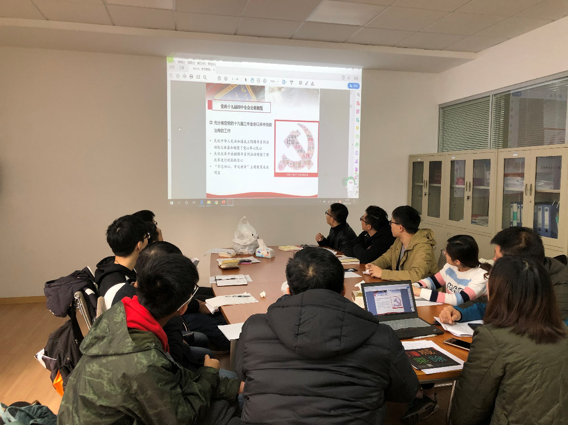 首先,陈哲传达了党的十九届四中全会精神。会议精神主要包括坚持党的集中统一领导、坚持人民当家作主、坚持全面依法治国等的13个显著优势,1个总体目标坚持和完善中国特色社会主义制度、推进国家治理体系和治理能力现代化的总体目标,坚持和完善党的领导制度体系、人民当家作主制度体系等13项坚持和完善的制度体系,以及1项重大战略任务和2项人事信息。他强调,要深刻领略会议精神, 作为一名党的基层干部,要深入群众,把为人民服务作为使命。同时作为一名环境专业的青年学生,要践行绿水青山就是金山银山的理念,做美丽中国建设的时代先锋,要以“像保护眼睛一样保护生态环境,像对待生命一样对待生态环境”的家国情怀和“功成必定有我”的使命担当,不断书写美丽中国的青春新篇章。
