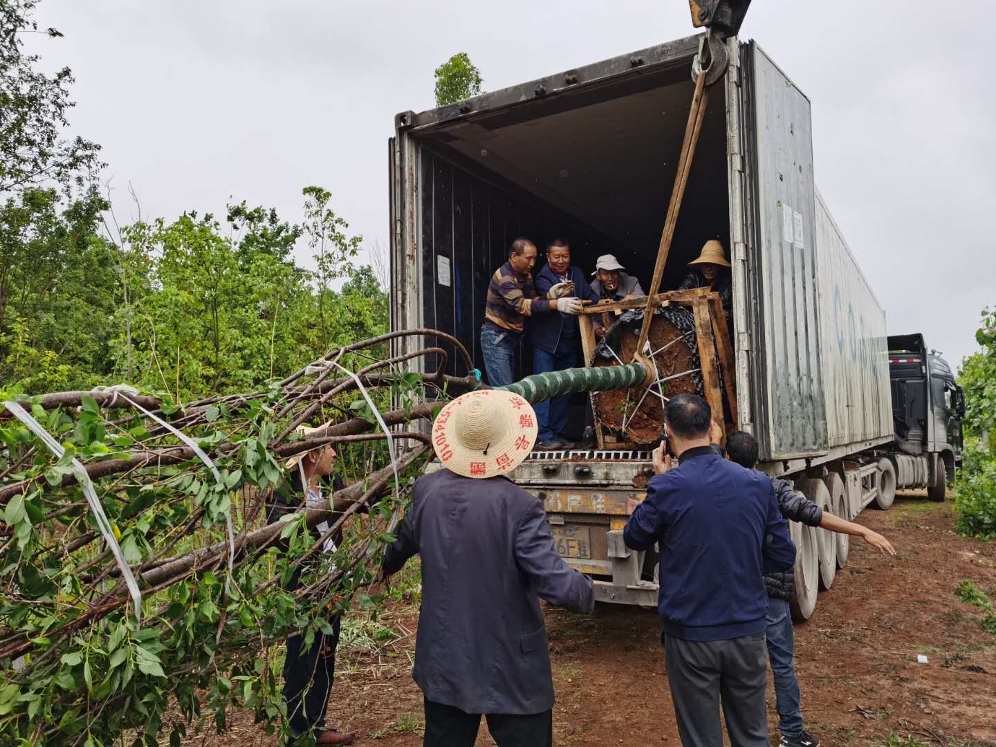 孔海南教授挑选滇樱花树苗,建议立即启运并在6月份之前进行移栽。5月22日,大理大学科技处处长李辉与孔海南教授挑选云南早樱花成树。5月27日,洱源大雨,首批30棵滇樱花树装车出发,目的地:上海。5月31日,一辆从大理洱源县来的冷链货车到达上海交大闵行校园,首批滇樱花树苗成功运抵,立即进行剪枝移栽。