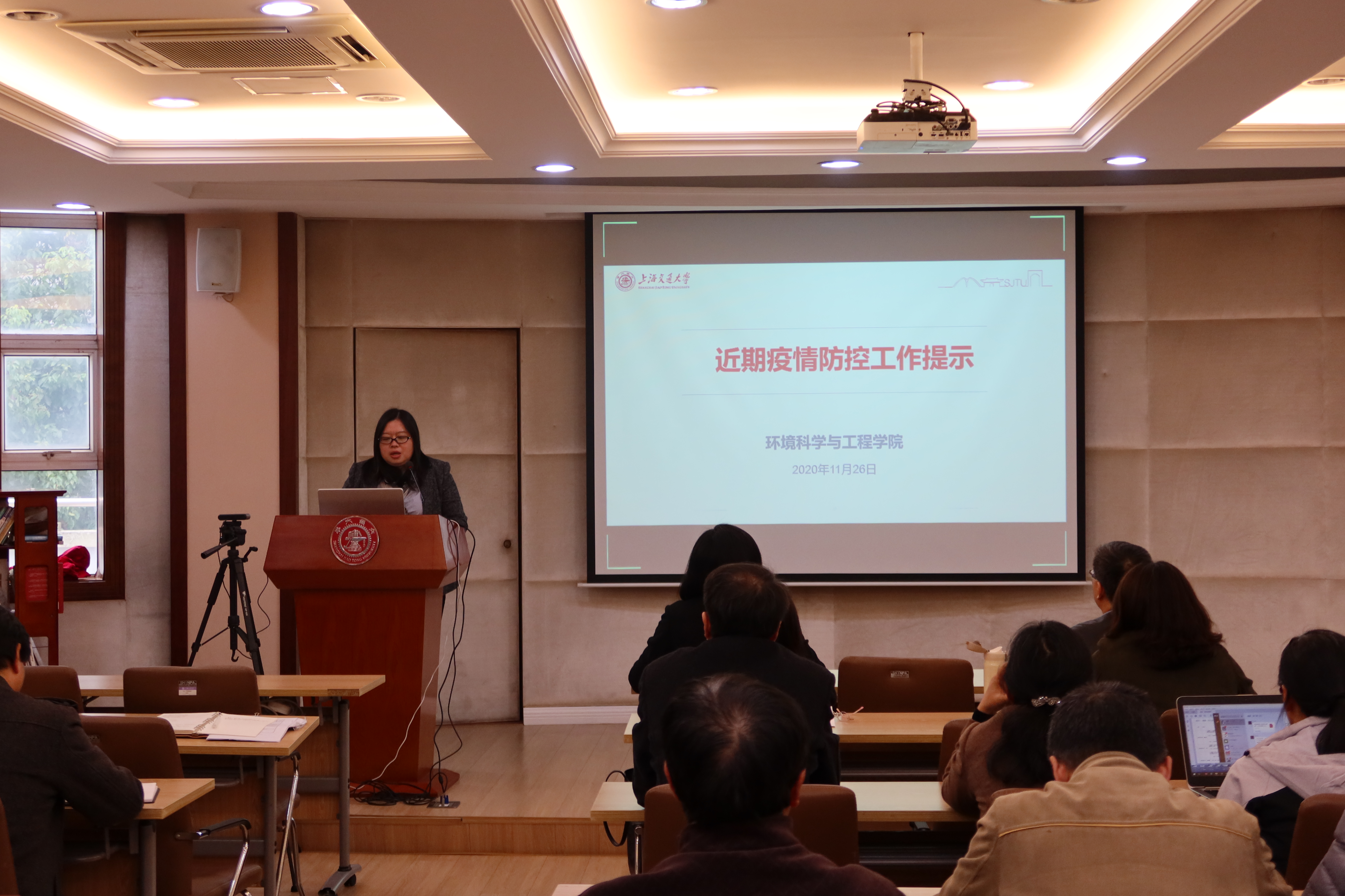 党政办主任王欣荣提示近期疫情防控工作,提醒全院教职工切勿放松警惕,做好个人防护,严格规范佩戴口罩、保持安全距离,并积极配合体温检测、健康码查验、身份核实等校园疫情防控工作。