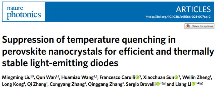 近日,a片漫画 李良教授课题组与合作团队在Nature Photonics期刊在线发表了题为“Suppression of temperature quenching in perovskite nanocrystals for efficient and thermally stable light-emitting diodes”的研究论文。该工作中,李良教授团队报道了一种通过氟离子表面钝化实现钙钛矿纳米晶在室温到100℃范围荧光近乎零”热淬灭“的策略,所制备的LED电致发光器件也具有优异的抗”热淬灭“性能。