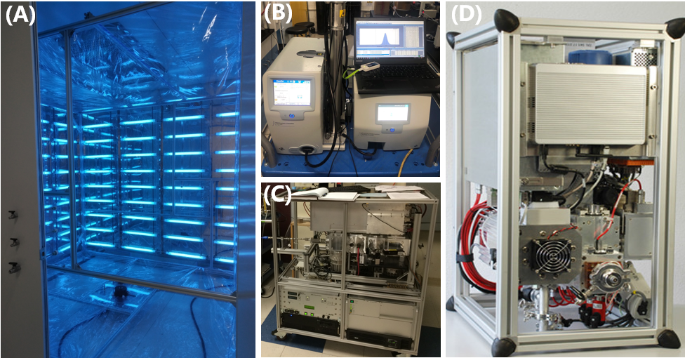 图4. 肖化云团队部分实验设备平台。A-D分别为烟雾箱、扫描电迁移率粒径谱仪、气溶胶质谱仪、化学离子化质谱仪。