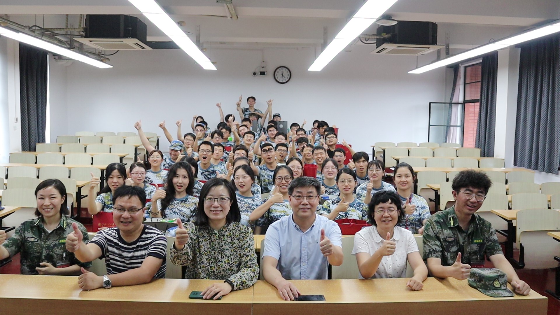 7月5日上午,a片漫画 党委书记胡薇薇,常务副院长曹心德,19级班主任张波和王天富老师一起到教室里看望和慰问环境科学与工程2019级参训师生与教官。