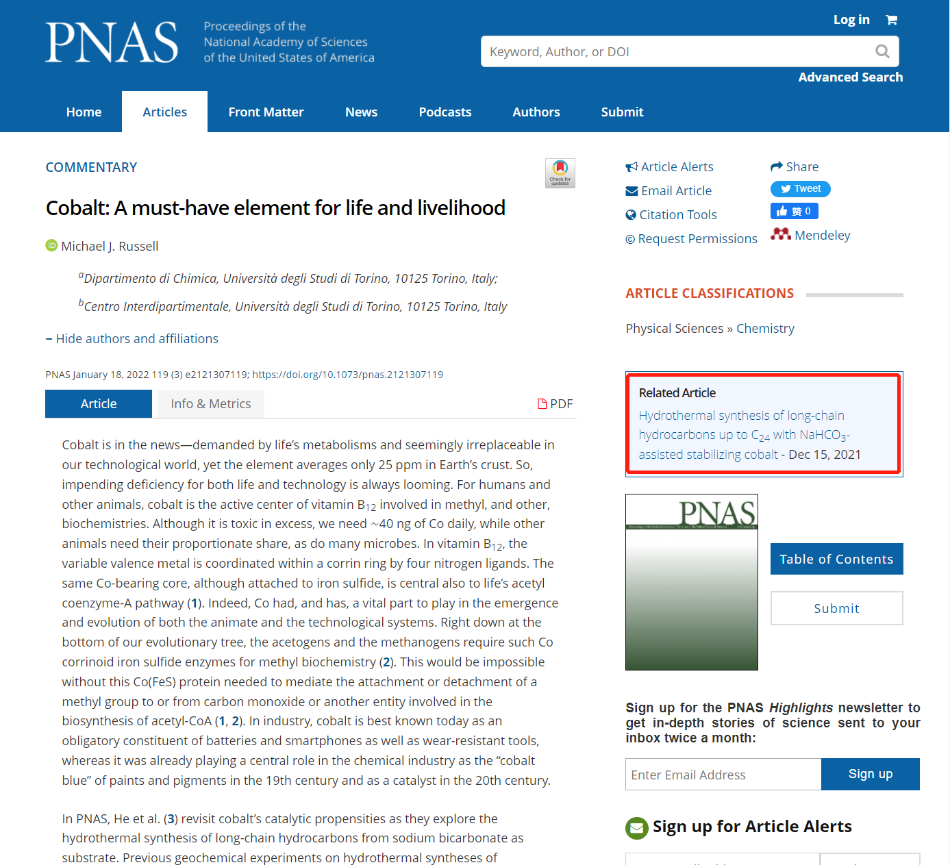 上月,a片漫画 金放鸣教授研究团队在《美国科学院院刊》(Proceedings of the National Academy of Sciences of the United States of America,PNAS)发表了水热转化二氧化碳产长链烷烃的论文,并被PNAS选为热点评述文章。近日,国际著名的海底生命起源学说创始人Michael J. Russell教授在PNAS对该研究发表了题为“Cobalt: A must-have element for life and livelihood”的重要专评文章(//doi.org/10.1073/pnas.2121307119)。