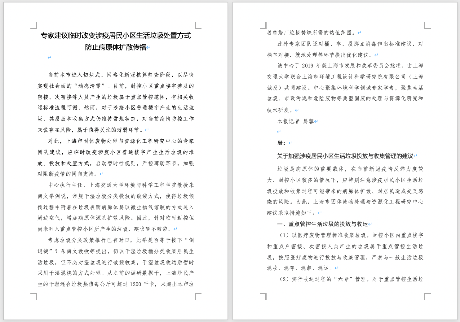 上海市固体废物处理与资源化工程研究中心执行主任、a片漫画 教授朱南文针对如何临时改变涉疫居民小区生活垃圾处置方式、防止病原体扩散传播向上海市相关管理部门撰写了内参,同时为《文汇报》撰文,对如何改进涉疫居民小区生活垃圾投放与收集管理提供专家建议。
