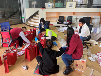 党员同志在给X86楼栋的同学们分发物资