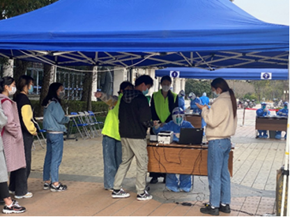 在核酸检测志愿服务中,支部党员樊林平、张博、罗颖、冯康宏、黄安华,查丽娜等同志在疫情初期人手严重不足时,主动参与到新图核酸检测志愿者服务,及时摸排密接人员,为控制疫情的发展作出巨大贡献。程勋强、陈佳斌、彭耀威、黄安华、谢智雄同志响应学校号召,甘冒感染风险,在防疫物资不足的情况下,做“最美的逆行者”,参与到密接和发热人员的核酸检测志愿者服务中。樊林平、金一卉同志在校内疫情稳定后,仍然奉献在第一线,化身“大白”,参与校内日常核酸检测志愿者服务。他们表示,核酸检测志愿者虽具有一定的危险性,但“甘愿奉献,不怕危险”是作为党员的使命和责任,希望能以实际行动践行“党员先上”的无畏精神,站好毕业季的“最后一班岗”!