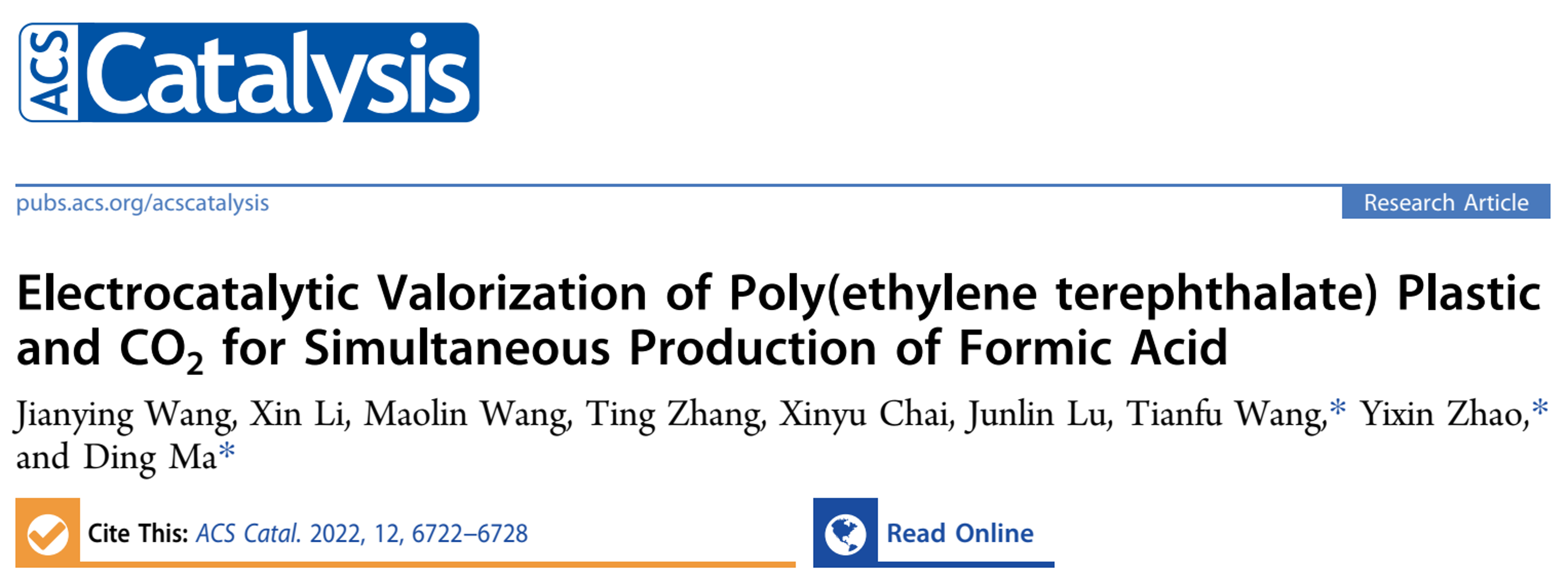 1. Wang, J. Y.; Li, X.; Wang, M. L.; Zhang, T.; Chai, X. Y.; Lu, J. L.; Wang, T. F.*; Zhao, Y. X.*; Ma, D.*, Electrocatalytic Valorization of Poly(ethylene terephthalate) Plastic and CO2 for Simultaneous Production of Formic Acid. ACS Catal. 2022, 12, 6722-6728.