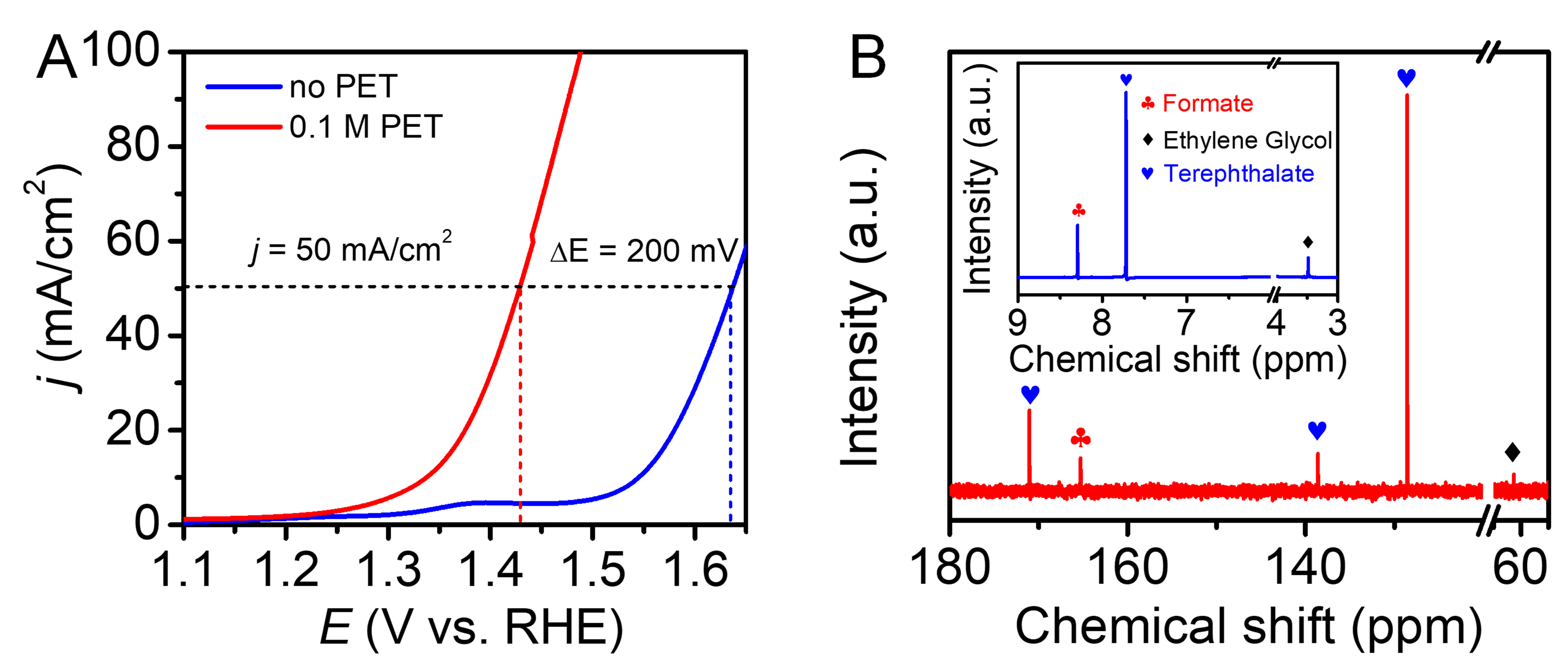 图4. (A) NiCo2O4用于PET水解产物氧化反应和水氧化反应的LSV曲线。(B) PET水解液经过电解后的1H和13C核磁谱图。