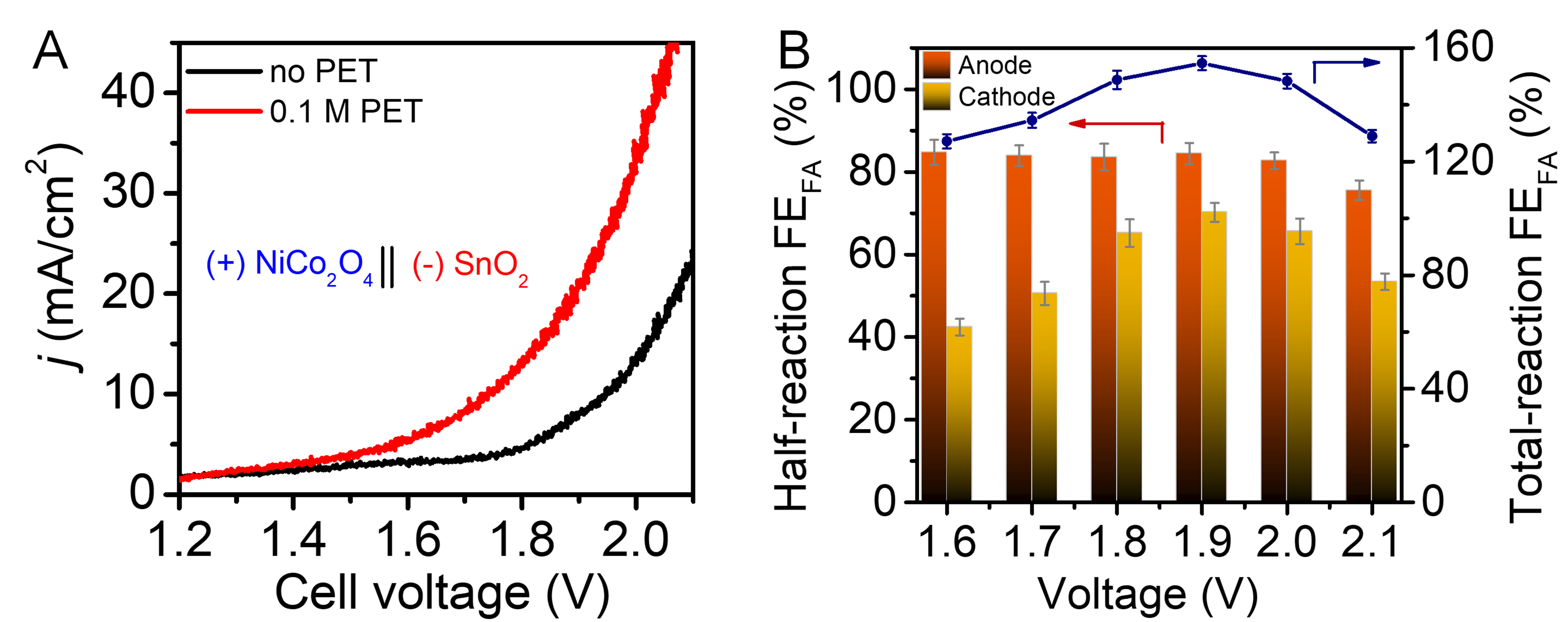 图5. (A) NiCo2O4||SnO2两电极催化体系在含有和未含有PET水解产物溶液中的LSV曲线。(B) 在不同反应槽压条件下,两电极体系中阴阳两极生产甲酸产物的法拉第效率图。