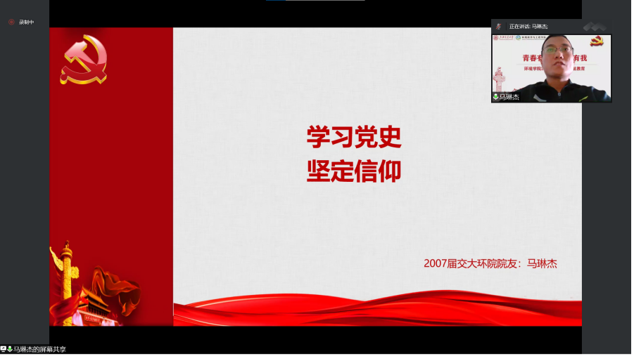 马琳杰以“学习党史,坚定信仰”为题,带领大家回顾了中国共产党百年历史上的三次重大决议,分析了百年大变局下的环境专业学生未来就业前景和环境人的使命担当。他结合自身成长经历,作为学长鼓励同学们养成良好的学习和生活习惯,练就过硬本领,在专业领域力求新的突破,为建设美丽中国贡献青春力量。
