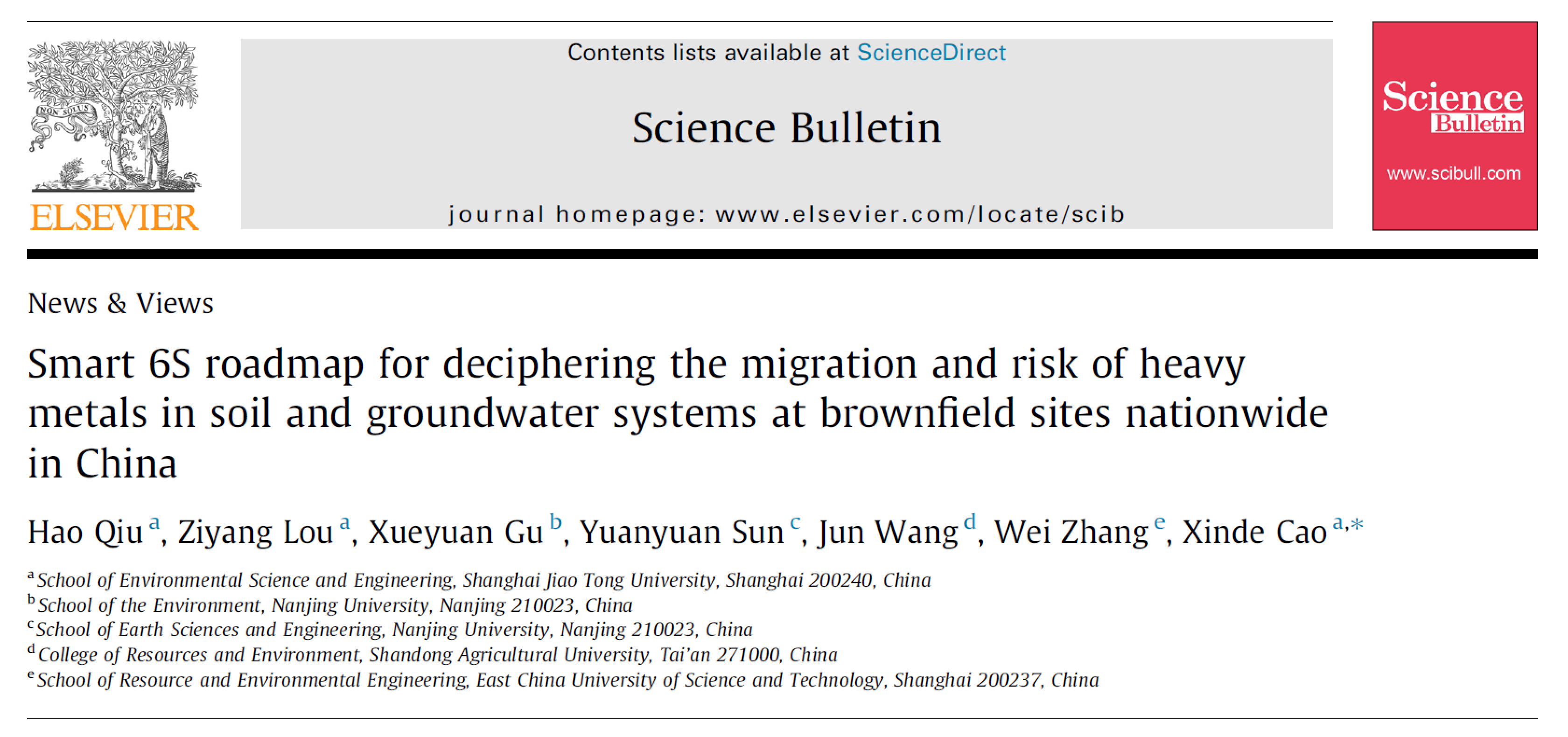 近期,a片漫画 土壤与地下水污染修复技术团队(曹心德教授团队)在综合性Top期刊Science Bulletin发表了题为《Smart 6S roadmap for deciphering the migration and risk of heavy metals in soil and groundwater systems at brownfield sites nationwide in China》的视点文章。团队领衔与国内有关专家合作,开创性地提出了智慧6S路线图,并基于此破译了我国代表性区域城市工业污染场地土壤和地下水系统中重金属迁移扩散潜势与风险。