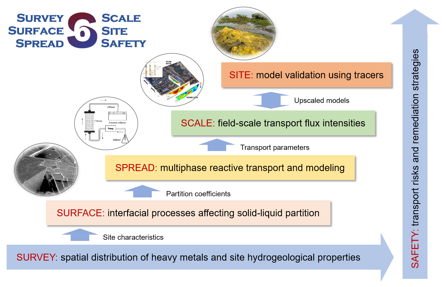 针对场地土壤-地下水系统中重金属迁移扩散动态规律不明、驱动机制不清及通量预测不准等问题,曹心德教授团队领衔联合国内近10家科研机构,提出了智慧6S研究路线图,通过对长三角、珠三角、京津冀、长株潭等代表性区域重点污染行业场地开展三维精准调查,厘清了水文地质条件、重金属空间分布及赋存特征(Survey);借助原位微区形态表征及非线性分配模型模拟等方法,阐明了重金属-土壤微界面过程及形态转化主控因素(Surface);通过室内尺度实验模拟,探明了土壤-地下水系统重金属多相介质运移过程及驱动机制(Spread);依据非均质随机理论,建立了场地尺度下重金属运移扩散模型并进行通量预测(Scale);利用同位素与基因谱等示踪技术,对不同区域场地土壤地下水中重金属迁移扩散模型进行了野外实地验证(Site);根据重点区域场地重金属扩散潜势、迁移能力及其迁移扩散风险,提出了不同区域场地重金属污染土壤风险管控和修复策略(Strategy)。研究成果丰富了土壤-地下水系统中重金属迁移扩散与预测理论体系,为我国城市“棕地”综合治理与安全利用提供了重要科技支撑。