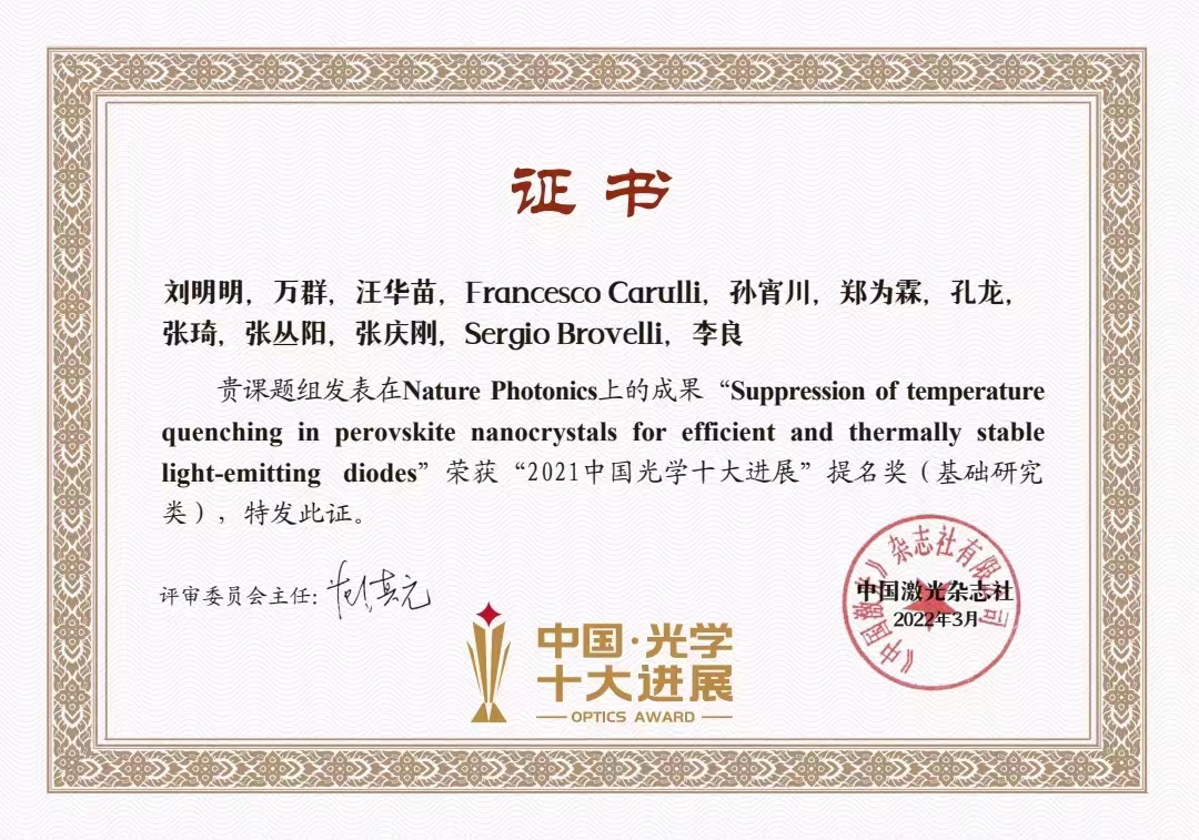 Nature Photonics论文荣获“2021中国光学十大进展”提名奖