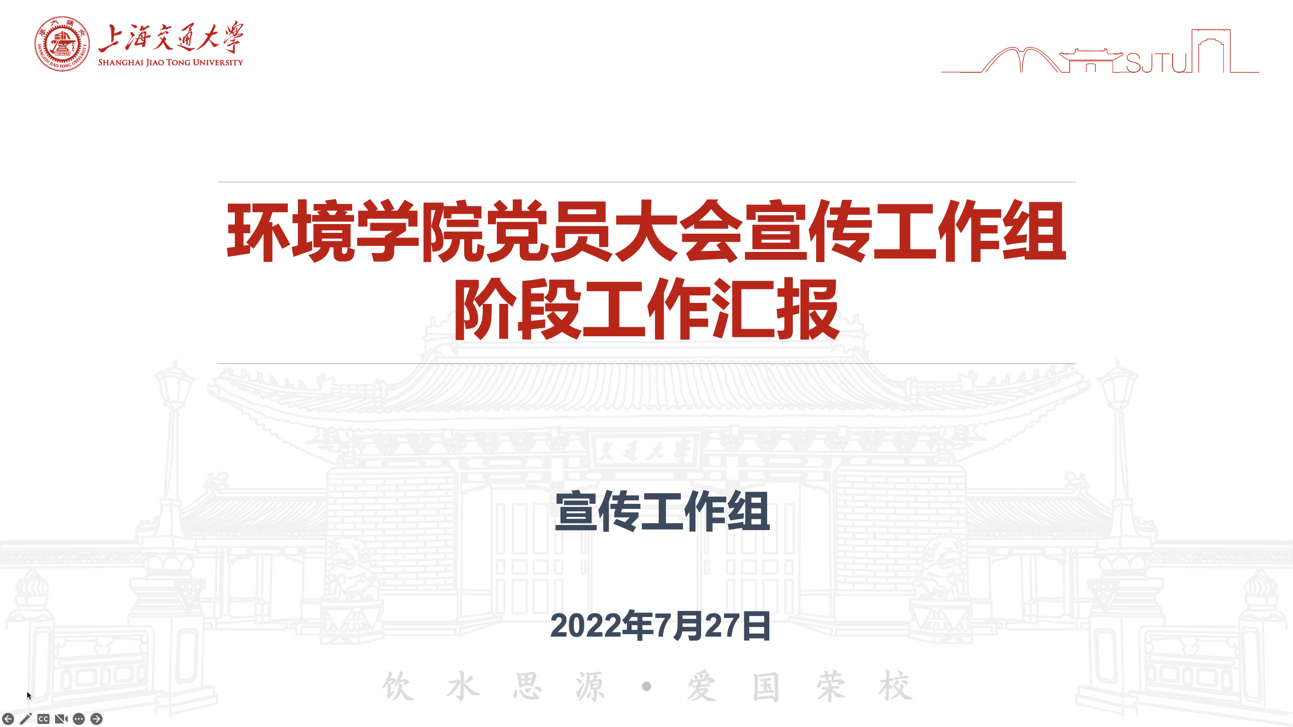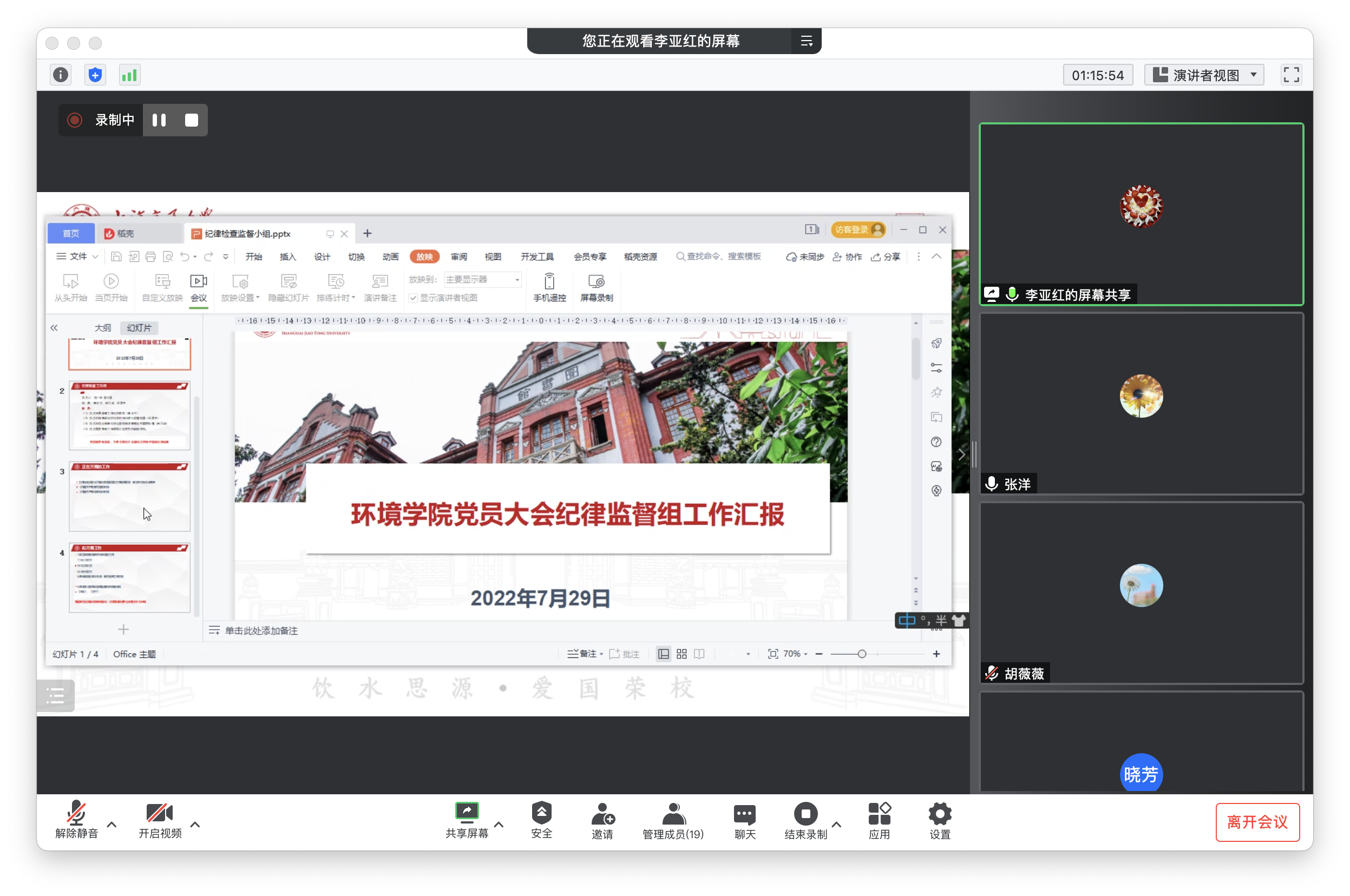 宣传组成员葛天意代表宣传工作组进行工作汇报,她简要回顾了动员部署会的会议精神,并从丰富加强基层党建工作、推进学院各项事业发展、积极宣传科普、其他工作配合等方面对上一阶段工作进行了梳理总结,进一步对标会议前、中、后三个阶段提出亮点性、及时性、常态性的计划内容。